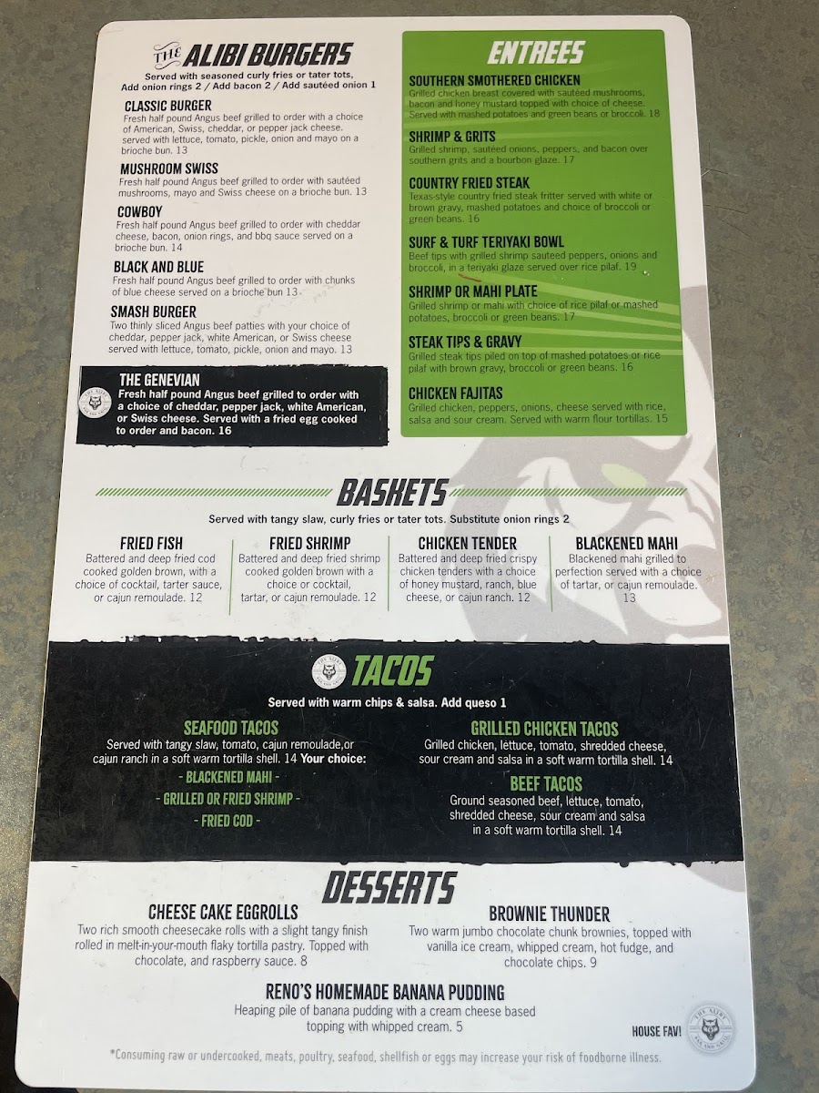 For lunch, options abound—from affordable dishes to a relaxed ambiance perfect for unwinding. The bar features refreshing drinks and local favorites, making it an ideal spot to catch up with friends over a game of pool or enjoy a lively fish fry. With its inviting environment and dedication to customer satisfaction, The Alibi Bar and Grill is the place to be for food lovers and social butterflies alike!